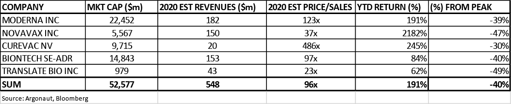 Profits from SARS-2/COVID vaccines are either going to be illusory if no vaccines are ever approved or a diminishing zero-sum situation whereby collective success from intense competition sees diminished volumes and reduced pricing power. It is likely that populations are already well advanced on achieving herd immunity with or without a vaccine19 so unless the virus mutates into something more deadly, demand will fall away dramatically. Although it is possible that one company might get lucky and receive regulatory approval before others, the short-term excitement in this stock is likely to be offset by disappointment in others20. If they are all successful there will be no pricing power. Between them these five pure-pay vaccine companies have raised $4bn of equity this year but management insiders have sold over $300m of stock: it is always worth remembering that the world of biotech is full of multi-millionaire management spivs whose companies have never made a profit nor ever brought a single drug to market.
