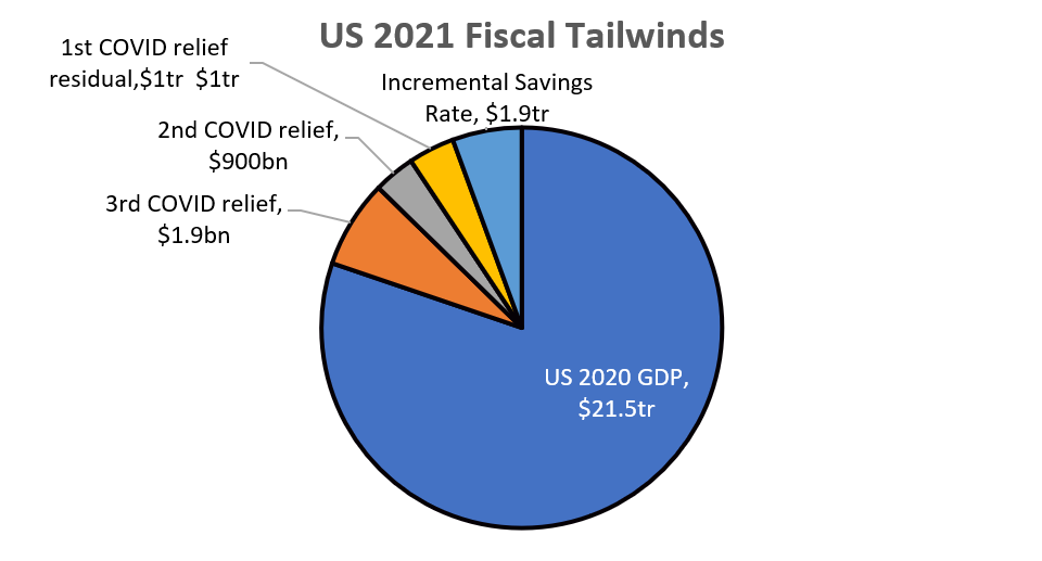 The US Senate has just approved the further COVID $1.9 trillion 2021 fiscal stimulus in addition to the $900bn already enacted (a combined 13% of 2020 GDP). Just under half of the original $2.4 tr 2020 stimulus has yet to be spent, whilst during lockdown US household savings are estimated to have risen by an incremental $1.5tr. Hence the fiscal tailwind to 2021 economic growth could be as much as 24% of GDP (Fig 1. US 2021 Fiscal Tailwinds3). With COVID restrictions gradually being reduced, US economic growth during 2021 is unlikely to disappoint even the most elevated estimates of c. 6-7%.