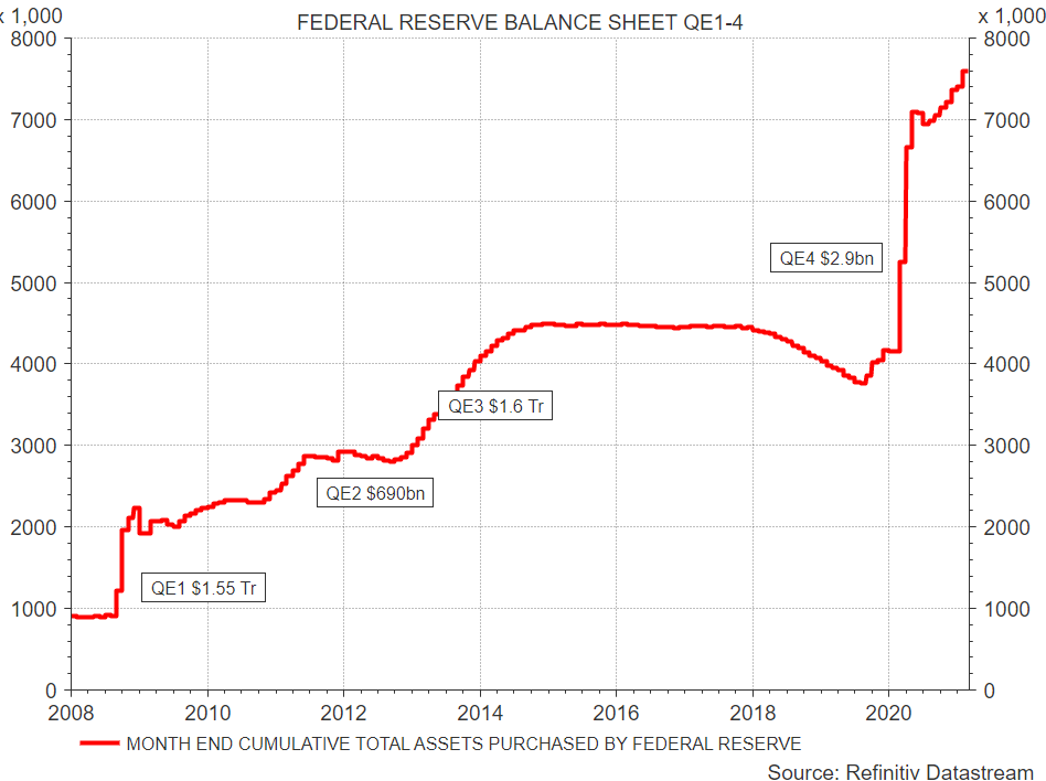 What are Chairman Powell’s policy options if Treasury yields rise to a level where they threaten to choke the economic recovery? This really depends on which part of the Treasury curve is inconsistent with the Fed’s desired path of interest rates (as formally expressed through the “dot plot”). The Fed could look to target specific assets incrementally as part of its current $80bn a month asset purchase programme. Alternatively, it could move to implement Yield Curve Control “YCC”, threatening unlimited purchases of specific duration Treasuries above a certain target yield. Fed Governor Leal Brainard has previously hinted at this in speech on July 14th, 2020: “Given the downside risks to the outlook, there may come a time when it is helpful to reinforce the credibility of forward guidance and lessen the burden on the balance sheet with the addition of targets on the short to medium end of the yield curve.”7 In view of the potentially unlimited commitment (in both quantity and time) of Yield Curve Control to further expand the size of the Fed balance sheet (already $7.6tr of 35% of GDP see Fig 3. Federal Reserve Balance Sheet QE1-4), this would constitute Powell’s “whatever it takes” moment.