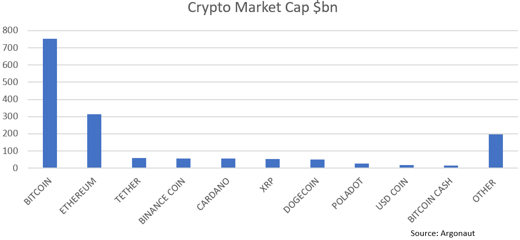 Owing to the proliferation of new digital currencies, Bitcoin continues to shrink as a proportion of cryptocurrency, now accounting for less than half its current market value (Fig 1. Crypto Market Cap). It is also a myth that Bitcoin is “immutable”2: it has been “forked” repeatedly into offspring crypto with different rules; ultimately absent sufficient remuneration in newly minted Bitcoin, the predominantly Chinese and Russian miners responsible for maintaining its transaction ledger and ensuring integrity of transaction could - and a cynic might predict probably will - eventually remove the 21 million future ceiling on Bitcoin supply3.