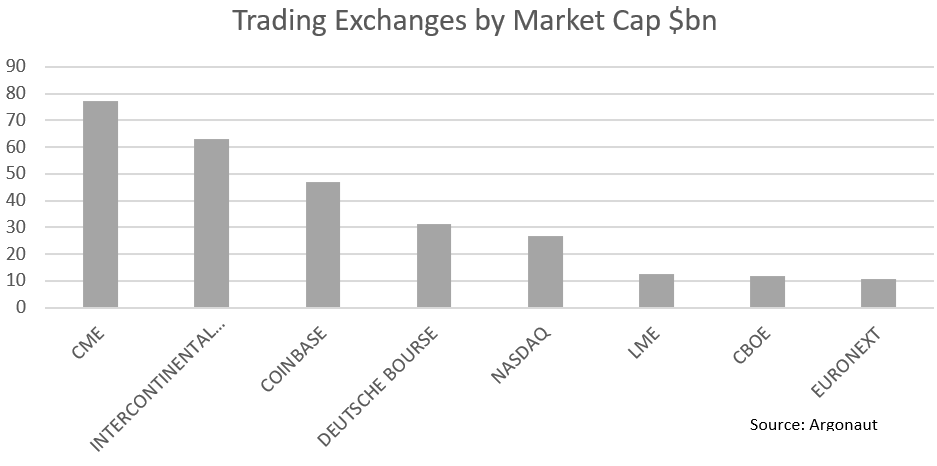 In view of its stated aims, the great irony of Bitcoin today is that 99% of all transactions are entirely speculative, taking place on one of the numerous crypto exchanges where intermediaries charge an extortionate economic rent.19 Surely this makes “Satoshi Nakamoto” blush? In addition to the typical 0.5% commission rate, there are additional flat fee charges per transaction, custody fees and lucrative finance charges for leverage, which when combined with volatility and stop losses ensures that the house almost always wins. Security of custody is not ensured: hence the recent unfortunate incident whereby the CEO of a Turkish crypto exchange is alleged to have stolen $2bn of customers assets.20 With an average fee per transaction of 3-4%,21 the crypto exchange is the modern-day Bucket Shop (See Fig 4. The Bucket Shop): its activities are curiously unregulated; earning unsustainably high commissions off peak trading activity on an asset class which arguably has no fundamental value. Curiously, the market value of the only publicly traded crypto exchange, Coinbase, is currently double that of the NASDAQ exchange (See Fig 5. Trading Exchanges by Market Cap) despite accounting for just 12% of crypto exchange trading worldwide, giving some idea to of the degree to which this industry is not only over-valued but over-earning relative to more traditional asset classes.