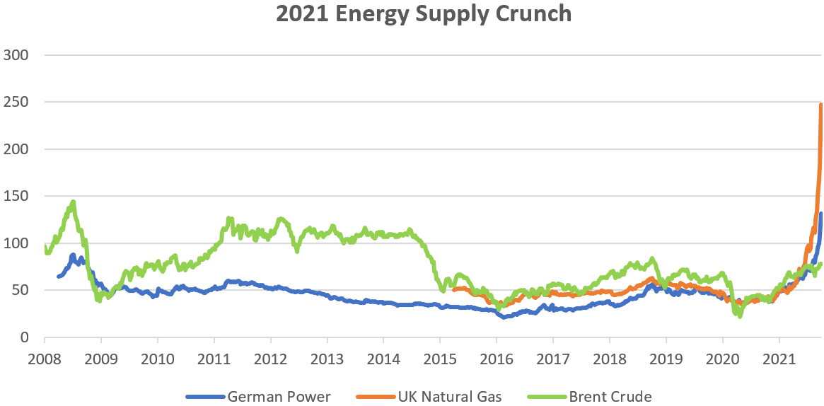 Much of the global economy is already in an energy supply crunch: since the summer spot European natural gas has risen +260%; spot German wholesale power +120%, both well above their 2008 peak when crude oil traded at $140/b (currently only $80/b) (Fig. 1: 2021 Energy Supply Crunch). Where will prices be when we turn on the winter heating?