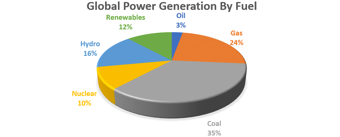 Electric Vehicles run on electricity which is still largely (62% globally See Fig 2: Global Power Generation by Fuel) generated by fossil fuels: “Not a lot of people know that” as British actor Michael Caine might say, which is strange. Security of cheap and reliable power which also fits the political decarbonisation agenda is the heart of the energy crunch.