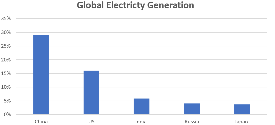 The Chinese economy is still particularly energy intensive: as the world’s largest manufacturer China now consumes 29% of all global power generated (the US is now a poor second at 16% and the UK at 1% See Fig 4: Global Electricity Generation). China is currently rationing power during a seasonally low period of power demand to prevent electricity blackouts. During 2020, Chinese electricity generation still increased by 3.5% (7.3% CAGR over the last decade). China’s economic expansion needs to be fuelled by power.