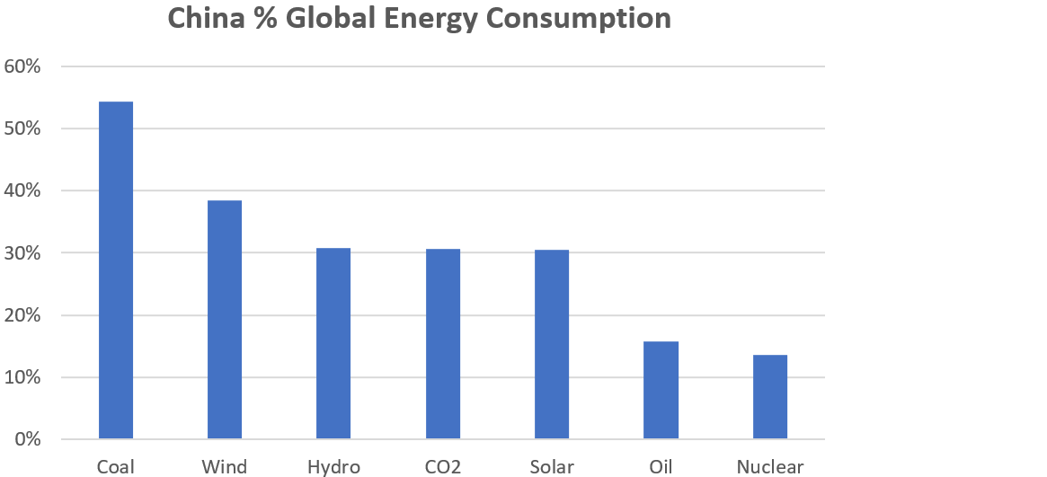 Lacking indigenous oil and gas reserves, China’s energy security is still overly reliant on its coal - which meets 57% of its energy needs See Fig 5. China Energy Production by Fuel – which is largely why coal still fuels 35% of global energy needs9 (ex-China coal demand dropped 9% last year whilst Chinese grew by 1%) and why China is the world’s biggest emitter of CO2 emissions (31%). Although China is also the world’s leading Renewable energy producer (39% of all Wind and 36% of all Solar) such is China’s overall power consumption that Renewables still only account for only 5% of Chinese production