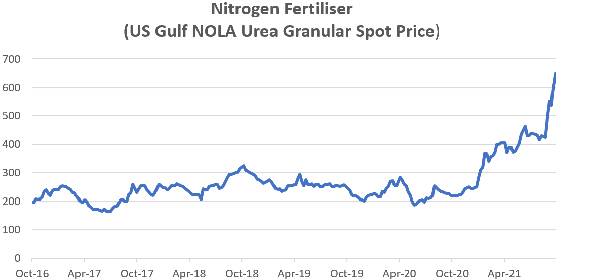 Take fertiliser: the recent rise in nitrogen fertiliser prices (Urea +150% YTD and +50% in past two weeks14) See Fig 8: Nitrogen Fertiliser (Urea) is partially a consequence of high natural gas prices resulting in the mothballing of European production (10% traded global market) (which ironically has caused a supply shortage of CO2 in the UK and had knock on effects for the frozen foods and fizzy drinks industry). However, it is also the consequence of China deciding not to use its coal to produce urea via ammonia for nitrogen export (another 10% of the global traded market15), for which there is no short-term fix, given new greenfield capacity may take 2-3 years to build and would in any case be constrained by fund managers imposing ESG constraints on any corporates otherwise willing to invest.