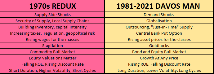 There is now a strong possibility that the 13-year bull market in growth stocks – and the 40-year bull market in rates - is over. Central bankers – unable to fix supply side constraints and unwilling to kill the cycle – may now have lost control. Chinese autarky means globalisation is on the wane. Into the void steps greater government taxation, regulation and heightened geopolitical risk. Pricing power has now moved to those commodity companies previously thought to be at the bottom of the food chain who will now reap supernormal profits, precisely because for over a decade all the capital went elsewhere. The capital cycle has now come full circle: Davos man is dead, usurped by 1970s redux. See Fig 9: 1970s REDUX vs. 1981-2021 DAVOS MAN.