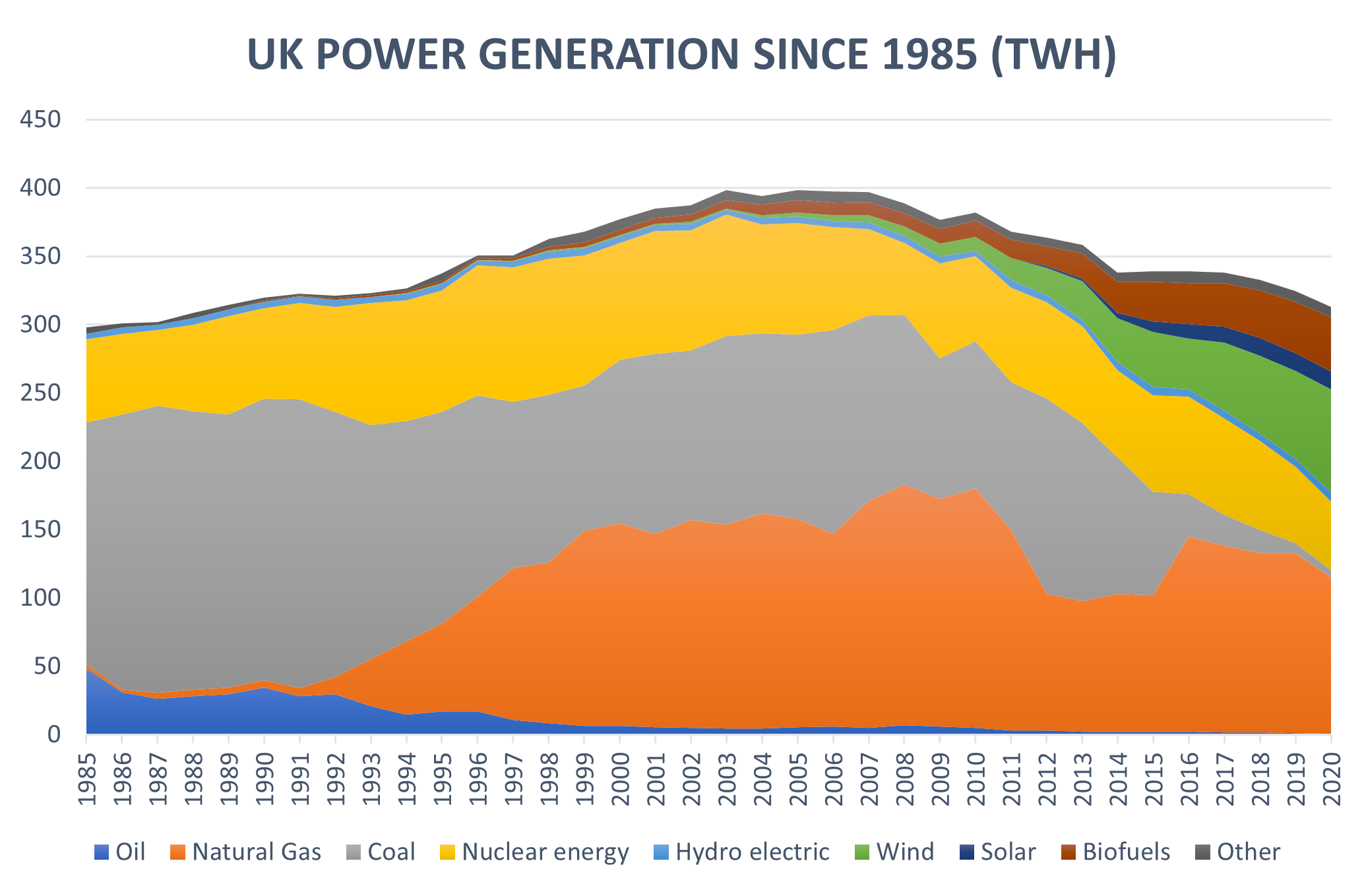 The UK government has congratulated itself that between 1990 and 2019, carbon dioxide “emissions fell by 44% while GDP rose by 76%, with the UK decarbonising faster than any other G20 country since 2000.”6 What is not admitted is that this was mainly achieved by replacing coal with natural gas as the main source of reliable baseload7 power (with roughly half the emissions). The UK energy mix has changed substantially from the 1980’s when it was largely coal based with some nuclear and the only renewable power was hydro (see Fig 3. UK Power Generation since 1985). Scottish and UK governments decided to switch off fossil fuel investment before it was prudent to do so. With declining North Sea production, over half of UK natural gas is now imported either via pipeline or LNG ships, creating a now obvious energy security problem.8 Rather than wash its hands of fossil fuel production, the UK will now need to bring energy production back onto its own balance sheet.