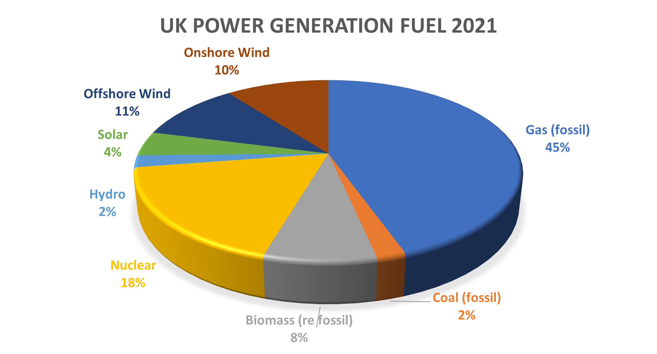 “Just before midnight” on a blustery night in December 2021, with demand two thirds of its daily peak, “renewables” did indeed briefly account for nearly 65% of UK power generation and fossil fuels only just over 6%. But there was also a high degree of midnight fantasy about this story: over the same day, fossil fuels had accounted for 20% of power generated with wind and solar 35%. “Biomass” – ironically highly carbon dioxide emitting wood pellets imported from the US, burned by power company Drax, but classified as “renewable” and oddly recipient of government subsidies3 - another 8%. Over the year, natural gas accounted for 44%, coal 2%, offshore wind 11%, onshore wind 10%, solar 2%, nuclear 18%, hydro 2%, and biomass 8%. In other words, over half of the UK’s power generation in 2021 came from fossil fuels and just a quarter from wind/water/solar renewables4(see Fig 2. UK Power Generation Fuel 2021). Cinderella’s carriage turned back into a pumpkin, her coachmen back to mice: the just-before-midnight decarbonisation of the UK power grid had been a greenwashing public relations fairy tale.