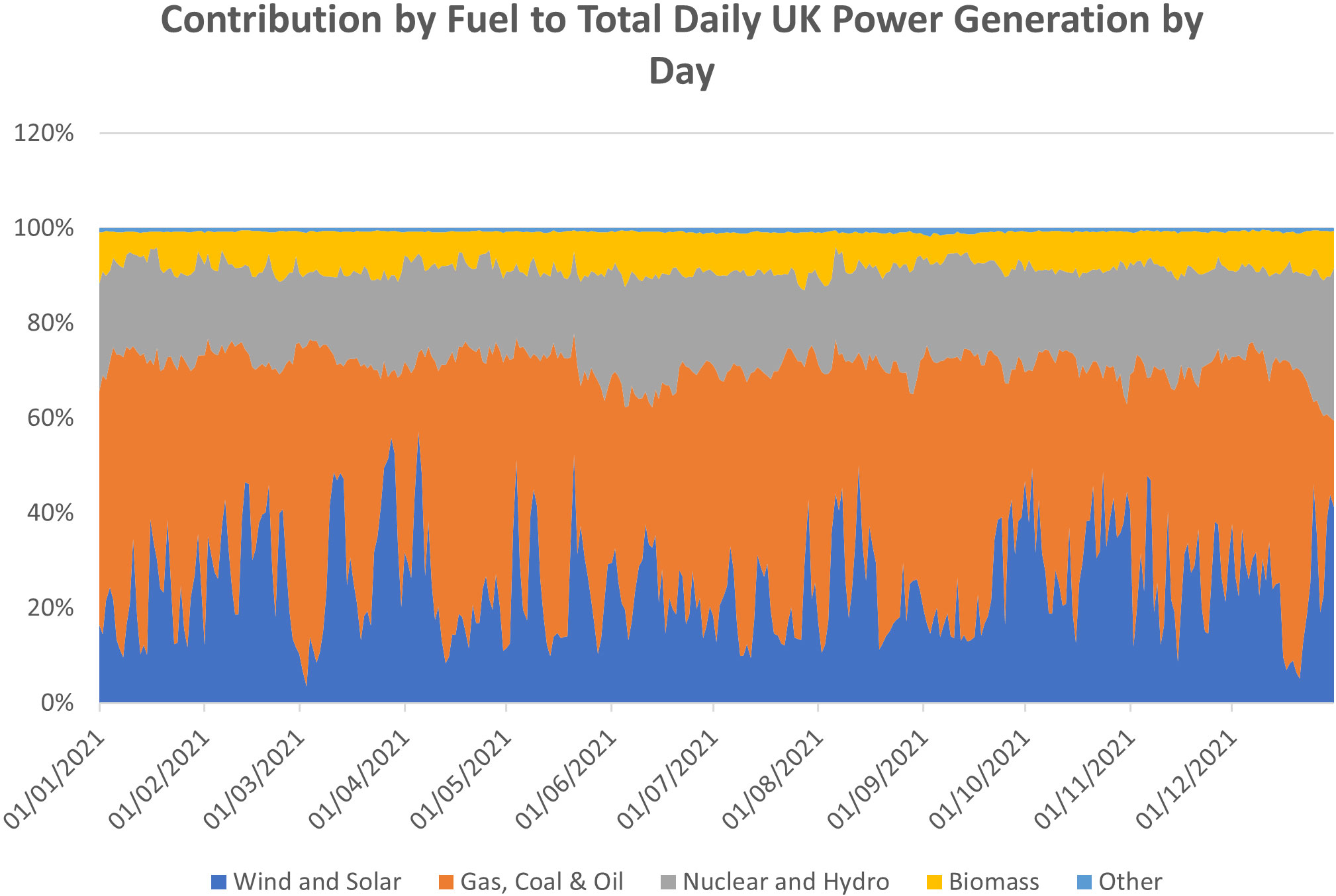 In UK grid economics there is currently a discount rather than a premium for reliable fuel for baseload power. When the wind blows UK power utilities are contractually obliged to accept power generated from wind turbines at a guaranteed non-market price (which in practice is subsidised). Renewable generation is given “first dibs” at supplying the grid but its ability to do so is entirely dependent on favourable weather (see Fig 1 Contribution by Fuel to Total Daily UK Power Generation by Day).