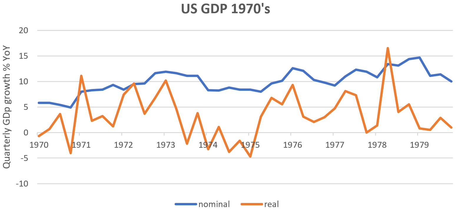 Whisper it gently, we are probably already in recession. US GDP in Q1 was -1.6% and the median forecast for Q2 is just 0%. Hence, it is already at best a coin toss that the US – and probably most of Europe17 – is already experiencing two negative real GDP quarters in a row. Although we are already more advanced in the overall economic slowdown than commonly perceived, this has largely gone unnoticed because it doesn’t feel like any recession in recent memory. “Nothing in the economy works, the economy doesn’t work for anybody without price stability” Powell said in May,18 but companies (profits) and workers (wages) live in a nominal return world which is still expanding at high single digits owing to inflation: a stagflationary situation witnessed throughout most of the 1970’s (See Fig 2: US GDP 1970’s). Capital – which lives in a real return world – has been drowning in the inflationary bubble bath.