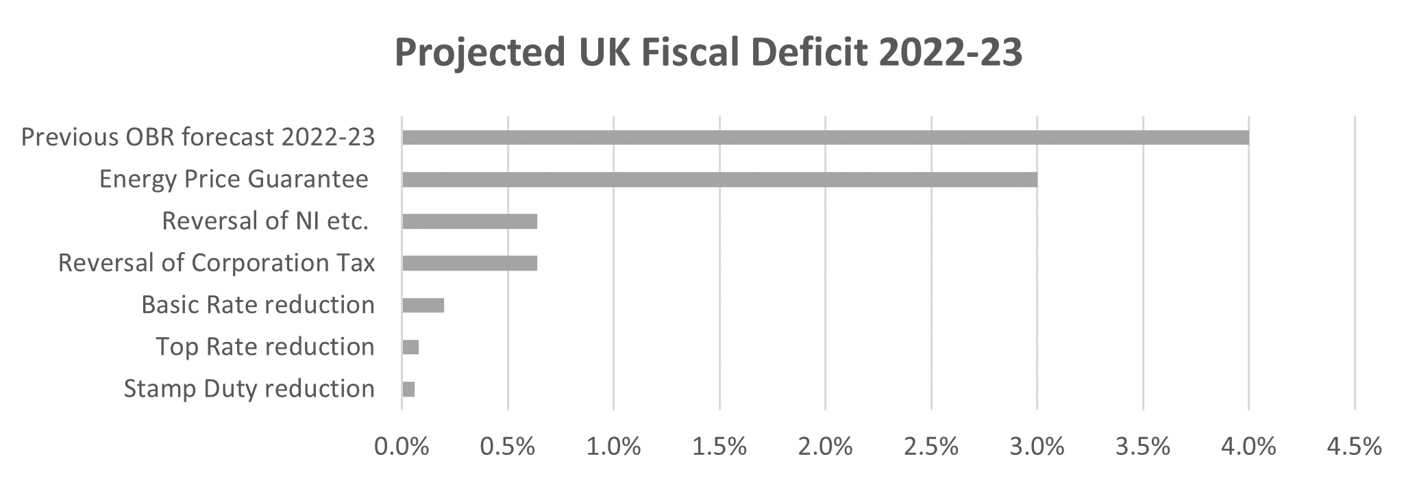 The most significant aspects of the mini-budget, notably the Energy Price Guarantee (estimated to cost £60bn over the first 6 months and £100-200bn over two years) had already been previously announced, as had the repeal of announced hikes in Corporation Tax (£16bn) and NI (£16bn), whilst the penny of the basic rate of Income Tax was brought forward a year (£5bn). The only new news was the abolition of stamp duty on transactions under £1.5m (£1.5bn) and the resumption of the 40% (£2bn) top rate of Income Tax, which had previously existed under both main political parties from 1988 to 2009 (See Fig 1: Projected UK Fiscal Deficit 2022-231).