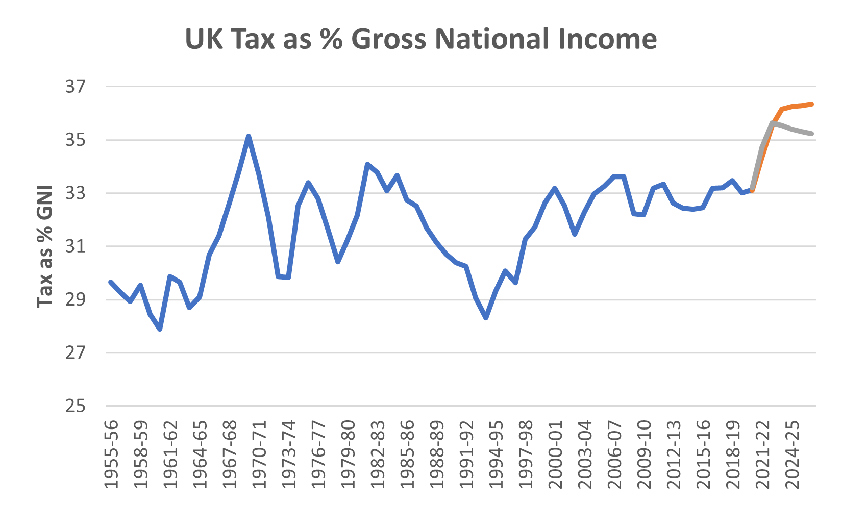 In 1976, the Labour government sought a bailout from the IMF, requesting a $3.9bn loan. But the significance of the IMF loan was largely symbolic: the amount was small relative to the 1976 projected fiscal deficit of £12bn (then $20bn), with only half of the loan ever drawn down. Rather the IMF intervention allowed the then Labour government to sell public spending cuts to its unionized and public sector clientele. As part of the bailout terms, the IMF insisted on spending cuts and Britain reducing its high rates of marginal taxation. Tax as a proportion of gross national income is significantly higher today than the 1970’s.