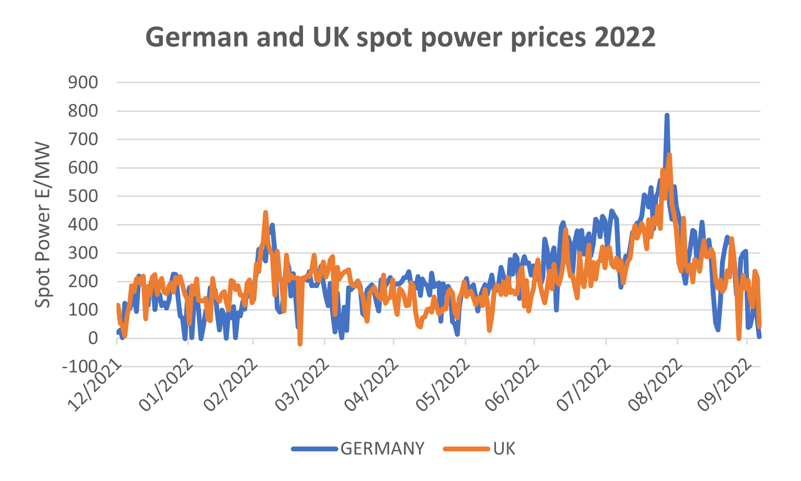 1. German and UK spot power prices this year (excel attached). Note these have been as high as €800 or £600 per MW but also on some days negative