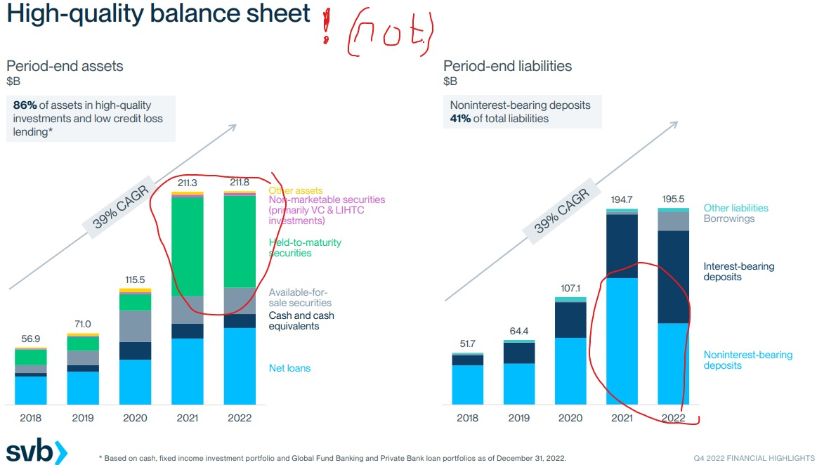 Banks are allowed to hold security portfolio assets as “hold to maturity” and not market them to market, so none of these losses were reflected in SIVB’s recent results. If SIVB could continue to fund the assets, it could hold them to maturity without taking a hit on its P&L or shareholders’ capital. But SIVB was losing deposits (not only because their clients were burning cash but also because they couldn’t afford to be competitive in bidding for new deposits because of the incrementally negative spread on their liabilities versus their assets). They were also already maxed out on their borrowing from the lender of last resort, the San Francisco Federal Home Loan Bank, and had already pledged much of their high quality collateral to secure this funding.