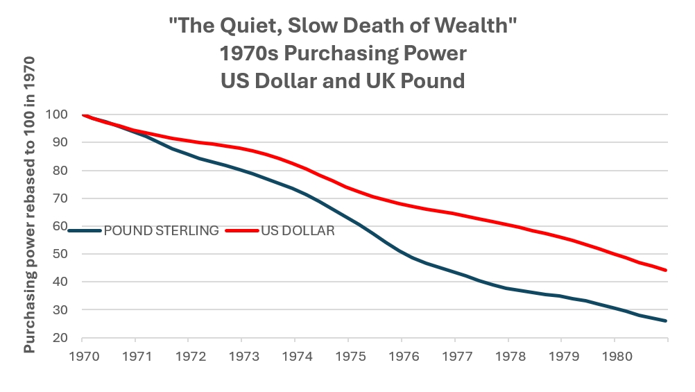 Whereas the deflation of the 1930’s saw the value of money increase, the inflation of the 1970’s had the opposite effect, turning modest nominal returns into real losses in purchasing power. Inflation meant that £1 in 1970 was worth just 30p by 1980; $1 was worth just 50cents.
