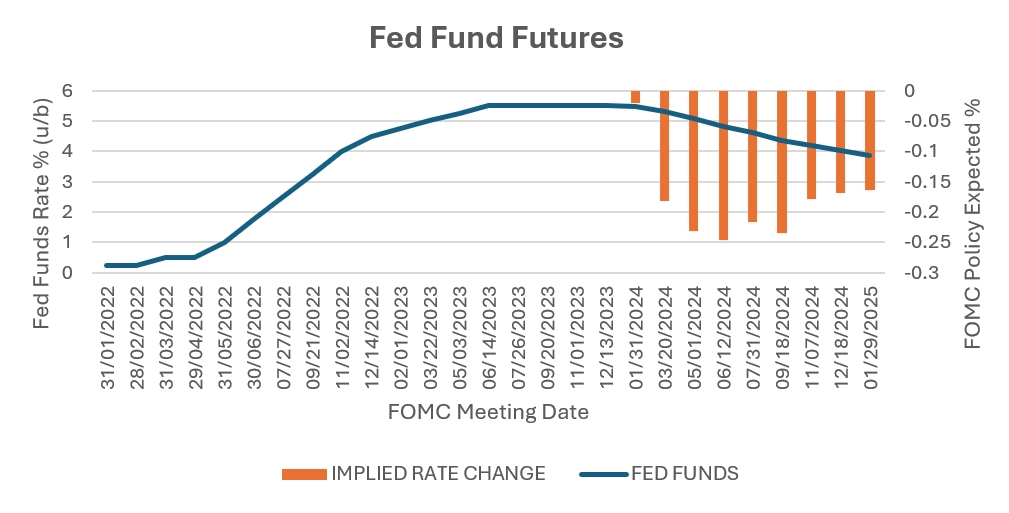 US interest rate futures are now expecting seven quarter point interest rate cuts this year, beginning in March, taking the Fed Funds rate from 5.50% to 3.75% by year end.