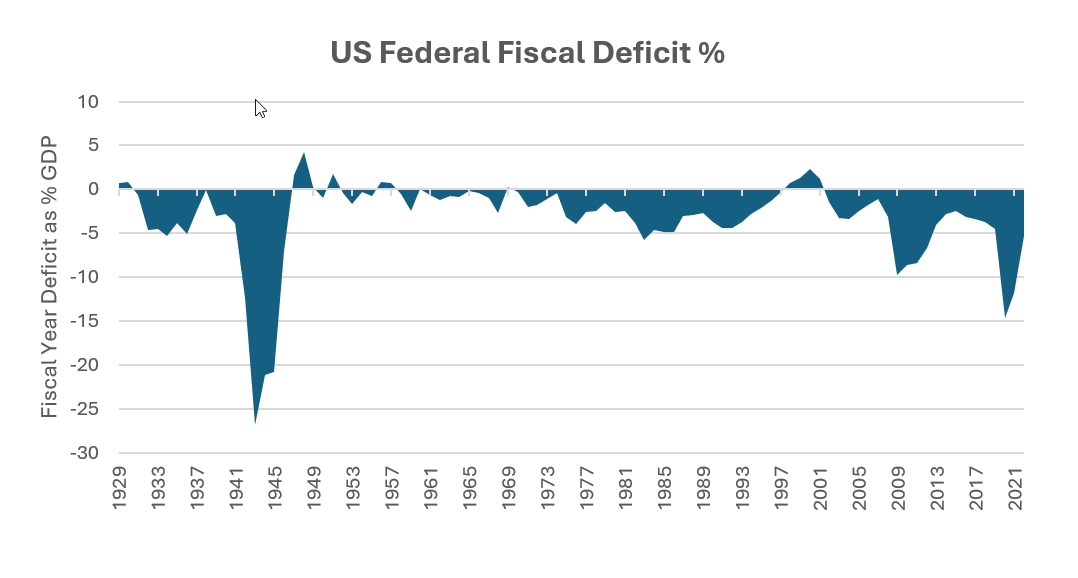 US Federal deficit spending is currently running at 8% per annum which represents the biggest peacetime government stimulus outside of the Great Financial Crisis in 2008 and COVID in 2020. Running a “hot” economy is a political choice that usually results in higher inflation.