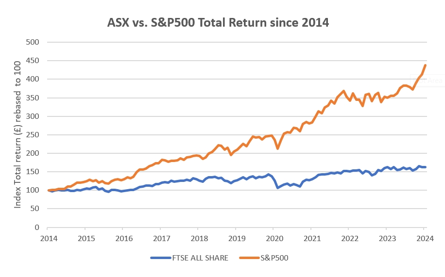 If you had invested £1 in the FTSE All Share Index a decade ago you would currently have 64p of profit, including dividends. But that same £1 invested in the S&P500 - the most representative index of American stocks - over the same time would have made a profit of £3.38p (over 5 times your money) (See Fig 1. FTSE All Share Vs. S&P500 Total Return).