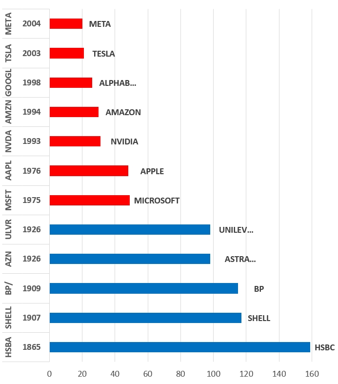 Some will of course argue that America simply has a bigger technology industry than the UK but there is nothing pre-ordained about this. “The Magnificent 7” companies were on average founded just 30 years ago (1994) with Tesla (2003) and Meta (2004) founded this century (See Fig 7: Tenure of “The Magnificent 7” and “The Unfortunate 5”).