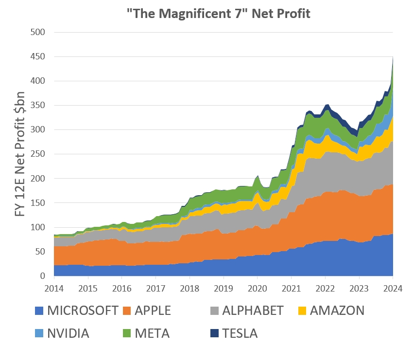 It might be easy to dismiss the share price performance of “The Magnificent 7” as an “investment bubble” until we consider that they are forecast to make over a combined $400bn of net profit this year (up from $85bn a decade ago) (See Fig 3: “The Magnificent 7” Net Profit since 2014 (in $ terms)).