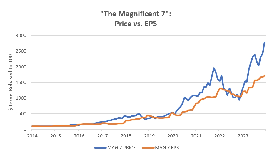 Fig 4: “The Magnificent 7”: Price vs. EPS since 2014 (in $ terms)