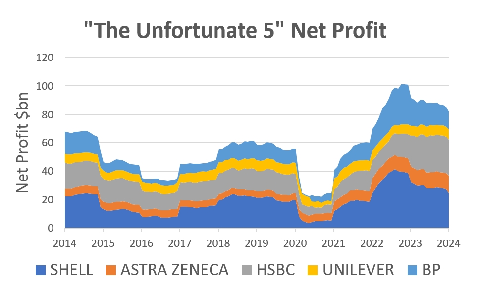 Together these companies have grown their net profits (in $ terms) by only 20% over a decade (See Fig 5: “The Unfortunate 5” Net Profit since 2014 (in $ terms)) (earnings per share by an average of 34%) explaining the more modest average 65% (in $ terms) increase in share price since 2014 (See Fig 6: “The Unfortunate 5”: Price vs. EPS since 2014 (in $ terms)). Whilst the US has “The Magnificent 7”, it seems that the UK has only “The Unfortunate 5”.