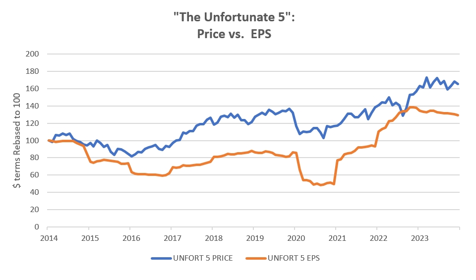 Fig 6: “The Unfortunate 5”: Price vs. EPS since 2014 (in $ terms)