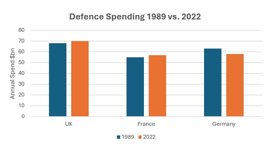 Fig 2: UK, French, German Defence Spend 1989 versus 2022.9