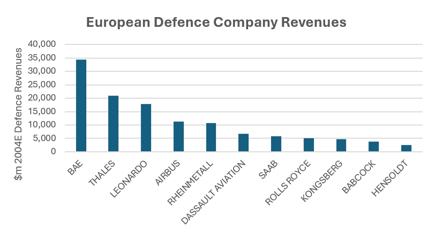 The entire annual revenues of the quoted European defence industry last year (including the UK) were just $132bn.15
