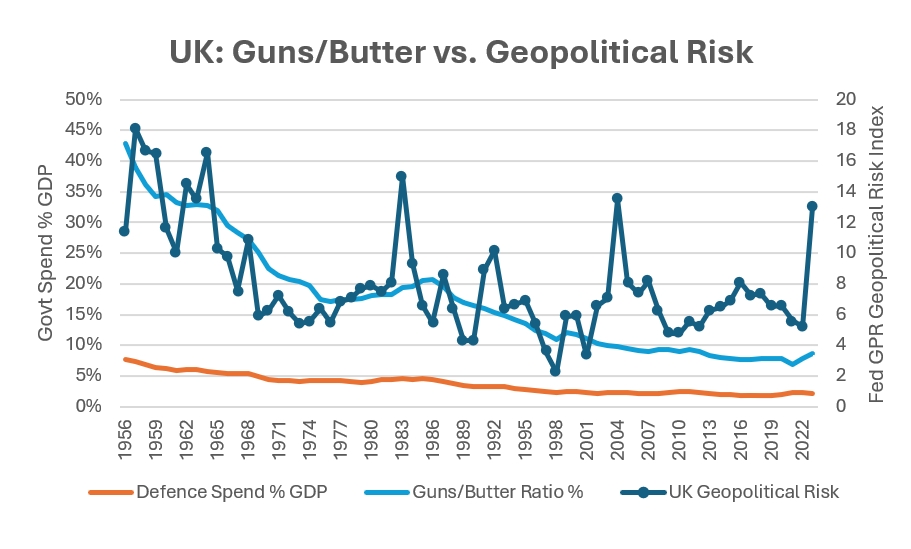 Fig 1. UK Defence Budget (Guns), Public Services (Butter) & UK Geopolitical Risk5