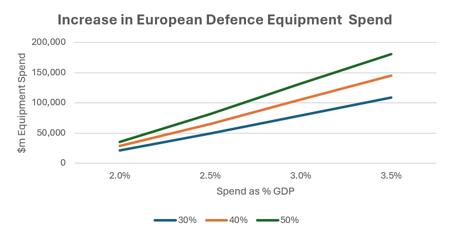 If NATO European annual spend of $375bn increases from 1.75% to 3% of GDP and 50% of this is spent on equipment exclusively sourced within Europe, then annual industry revenues will double17.