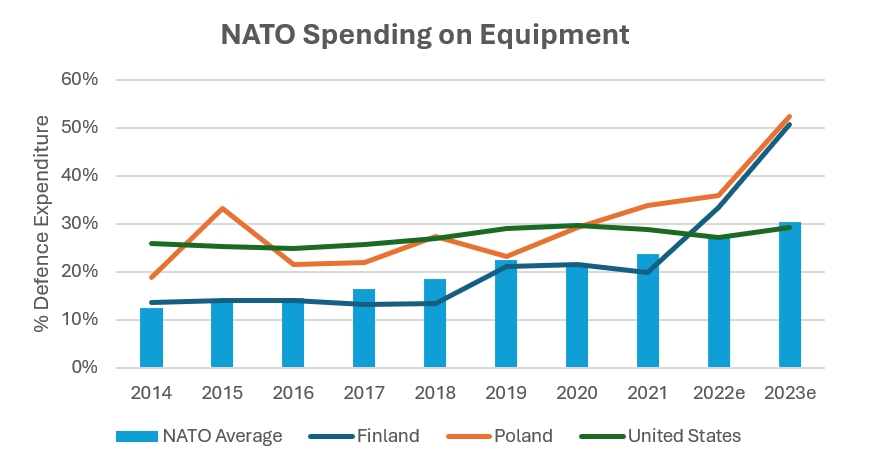The NATO average today is 30% (up from just 10% in 2014) but countries in the frontline such as Finland and Poland are currently spending 50% on equipment.12