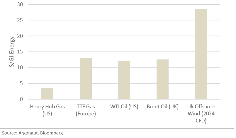 This abundance manifests in Henry Hub gas (the benchmark price for US natural gas) currently trading at $3 per gigajoule (GJ). This compares with TTF gas (the European benchmark) at $13/GJ and crude oil at $12-13/GJ. By contrast, the 2024 UK offshore wind CFD auction was done at an energy equivalent of $28/ GJ (subject to upwards only price revisions over the course of the 15-year contract)!