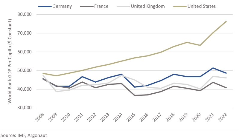 At the time of the financial crisis in 2008, standards of living in the US, UK, France and Germany were roughly comparable. Since then whilst GDP per capita in the US has risen from $48k to $78k, standards of living have now remained stagnant for 15 years in Western Europe.