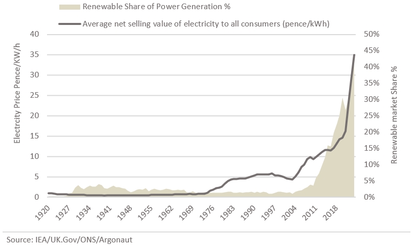The “Renewable” UK market share has subsequently increased to a reported 42%, whilst the average annual price increase since 2011 has been over 10% per annum (five times the average of the previous century). As the share of “Renewables” continues to increase so too will our electricity prices.