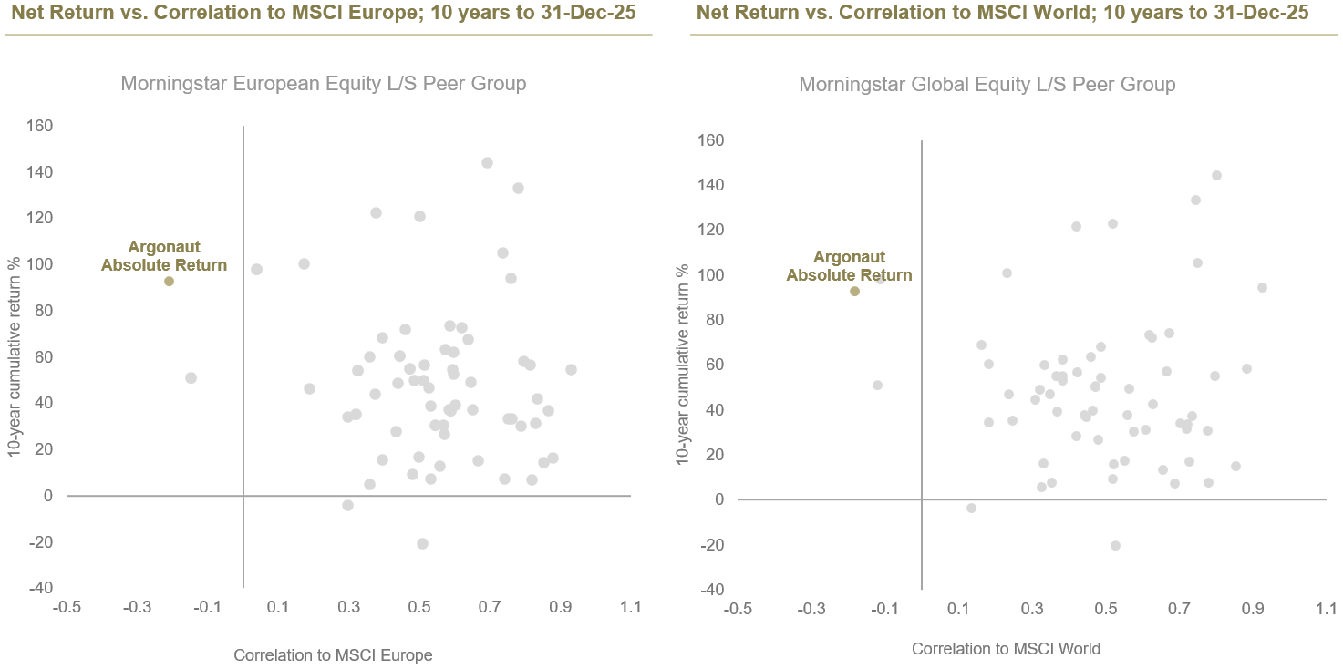 Source: Argonaut Capital Partners as at 31-Dec-25. All performance data above refers to YFS Argonaut Absolute Return Fund, uses the GBP I share class and is net of fees. Correlation calculated in base currency on a monthly basis. The YFS Argonaut Absolute Return Fund’s prospectus changed in 2021 from being ‘predominantly’ to ‘mainly’ pan European equity exposure.