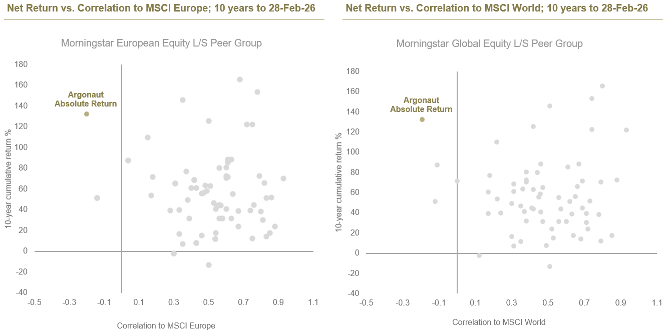 Source: Argonaut Capital Partners as at 28-Feb-26. All performance data above refers to YFS Argonaut Absolute Return Fund, uses the GBP I share class and is net of fees. Correlation calculated in base currency on a monthly basis. The YFS Argonaut Absolute Return Fund’s prospectus changed in 2021 from being ‘predominantly’ to ‘mainly’ pan European equity exposure.