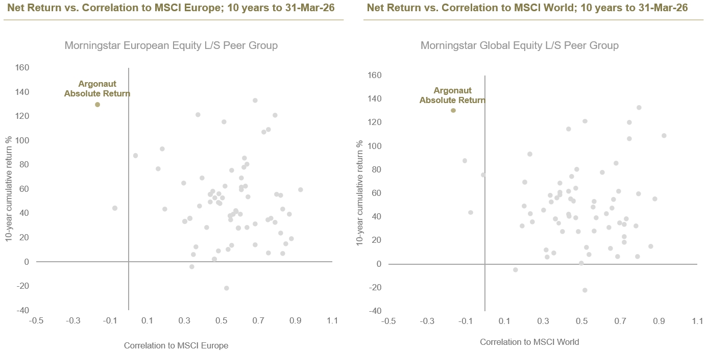 Source: Argonaut Capital Partners as at 31-Mar-26. All performance data above refers to YFS Argonaut Absolute Return Fund, uses the GBP I share class and is net of fees. Correlation calculated in base currency on a monthly basis. The YFS Argonaut Absolute Return Fund’s prospectus changed in 2021 from being ‘predominantly’ to ‘mainly’ pan European equity exposure.